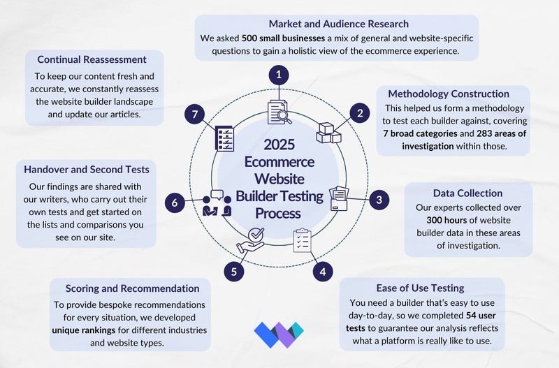Home » Ecommerce Website Builders » How We Conduct Our Ecommerce Website Builder Research How We Conduct Our Ecommerce Website Builder Research We may receive a commission from our partners if you click on a link and purchase a product or service on their website. Learn more Written by Annie Angus Updated on June 5, 2025 Comments: 4 On this page Our Research Process Sales Features Website Functionality Design Features User Experience Pricing Help and Support Reputation Meet the Researchers We know building your own online store can be a daunting task. Where do you start? How much does it cost? How difficult will it be? What features do you need to thrive?That’s where we come in. Website Builder Expert is the number one resource for information about how to get online. We don’t just try platforms – we carry out professional, in-depth research, and really put them to the test.When it comes to building an online store, the easiest and most cost-effective option is to use an ecommerce website builder. Website builders are online platforms that provide you with the framework and support you need to design your own ecommerce site.Naturally, some are better than others. We’ve tested the best ecommerce website builders around to bring you a definitive answer as to which one is best for your needs. But how do we know which providers to recommend? Read on to see how we conduct our ecommerce website builder research.Click the image to find out more about us. Our Research Process We’re called Website Builder Expert for a reason – we’ve got years of experience in the industry, testing builders and platforms thoroughly. After all, we want to bring you reliable information and make sure we’re talking about the factors that matter most to you. ✔️Why You Can Trust Us Before we get into it, let me put your mind at ease. In accordance with our editorial code, our primary aim is to bring readers fair, accurate, and honest recommendations to help them make informed decisions. And thanks to our in-house research team who carry out hours of analysis, we have the data and hands-on experience to back up our lists, reviews, and guides.Because of this, we’ve never sold rankings or positions to companies, and we can guarantee you that we never will. So, how do we make any money? Website Builder Expert’s income comes via referral commissions and affiliate links across our pages. If you follow one of these links, find you’re happy with your chosen builder, and sign up to the platform, that’s when we get paid.Our Research Process: OverviewOur research process involves a lot of steps, and after more than 300 hours of work, the result is fair and data-driven ratings. We cover the good but also don’t shy away from the bad, so you can trust our recommendations to be impartial.Get a summary of our process below:Our Methodology Areas: ExplainedAs you can see from the visual above, we research seven core areas of investigation when testing ecommerce website builders. But how to we know which areas to research? Well, similarly to our website builder research process, we surveyed 500 small businesses to find out their key priories and concerns in todays landscape.However, our website builder testing is aimed towards content and informational websites – think blogs and portfolios – whereas our ecommerce builder testing has an additional focus on online selling and an emphasis on what matters most to small businesses:Sales FeaturesWebsite FunctionalityDesign FeaturesUser ExperienceHelp and SupportPricingReputationThese seven categories are then broken down even further into a total of 51 subcategories. Within these subcategories, we investigate 283 individual factors, covering things like template options and SEO more closely.Gathering scores from each test gives us a total rating for that core area of investigation, and once we have every score, we calculate the overall score for that ecommerce builder.A key stage of our research process is our user testing. We bring in 54 everyday users to test the builders and platforms for us, giving us valuable insight into how user-friendly they are. Then, our writers go through the very same tests to get them up to speed.Of course, this is just a general overview of how we bring you the best recommendations, but I’ll explain exactly what’s involved with each area of investigation below: Sales Features Because we’re looking at ecommerce website builders specifically, it’s important that our areas of investigation reflect this. Sales features – any attribute or tool that helps merchants sell products – are incredibly important for online stores, which is why it’s our highest weighted category, accounting for 30% of the builder’s overall score.Due to its importance and the sheer amount of sales features there are to cover, we separated them from our general website functionality category. Here are just a handful of the sub-categories we investigate:Multi-channel integration – Can you link social channels and marketplaces to your site?Payment processing fee – Does the builder charge you payment processing fees, or cover them itself?Inventory – How many products can you sell and what inventory management tools are provided?Sales type – What types of products can be sold through the builder? Physical? Digital? Services?Security – Does the builder keep your website and customer data safe from harm?Promotion and discount codes – Does the builder provide promotional tools, and are discount codes supported?Shipping options – What tools are you provided with to help with shipping?Payment options – Can you accept payments from the major providers?Mobile app – Can you manage your online store on the go?Our 2025 research found that every ecommerce website builder has made improvements to its sales features since last year, so it’s important to look at the individual factors closely before committing. Website Functionality A website